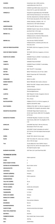 El concepto todoterreno sólo se ve acentuado por la suspensión total con 150 mm de recorrido en la Horquilla y el Cuadro. La velocidad viene dada por la interacción del deportivo Motor Bosch "Performance CX" y el cambio de marchas de Shimano, finamente graduado.